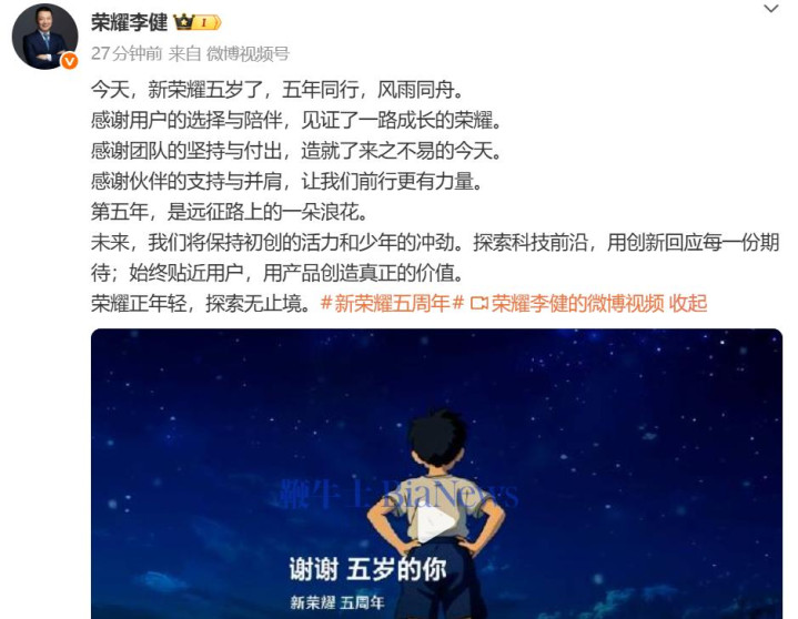 你的位置:云体育app官网入口手机版百度 > 新闻动态 > 新荣耀5周年, CEO李健发表致谢